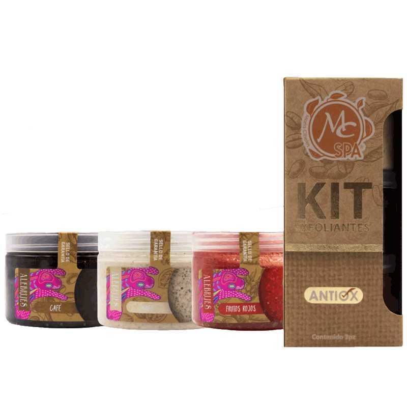 Kit con 3 piezas de exfoliantes de 150 gramas cada uno.